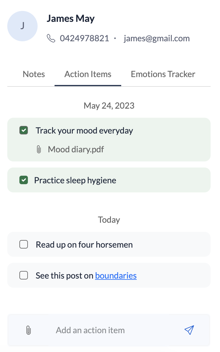 Manage both Telehealth and in-person sessions effectively. Digitise your notes & action-items in real-time. Review your notes and your client's progress in the 5 minutes you get before every session. No separate, clunky systems.