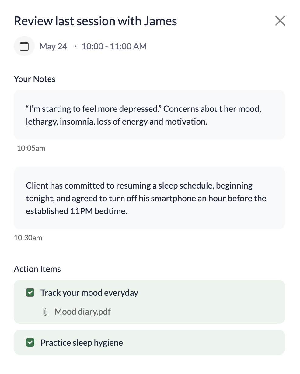 You can schedule follow-ups, add action-items and get ready for your next session, all within 10 minutes.